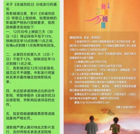 若截图内容属实,《非诚勿扰3》或有滥用影片影响力的嫌疑,这无疑违背分线发行“市场主导、灵活协商”的初衷。此外,今年贺岁档新片体量多于往年,又有现象级黑马《一闪一闪亮星星》(华谊参投)、大牌云集的《金手指》《潜行》等同台竞技。在影片质量未明前指定“硬性排片要求”,对影院而言是一种冒险。