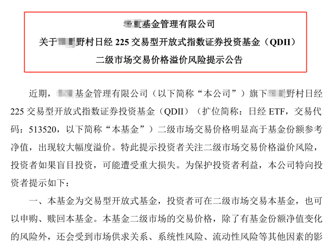 上周末,基金公司曾发布公告提示风险,旗下日经ETF二级市场交易价格明显高于基金份额参考净值,出现较大幅度溢价。特此提示投资者关注二级市场交易价格溢价风险,投资者如果盲目投资,可能遭受重大损失。